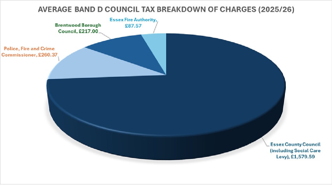 On average, each household will pay £2,144.53 in Council Tax in 2025/2026. Only £217.00 of this amount is paid to Brentwood Borough Council to help fund the services it provides to local people and businesses.